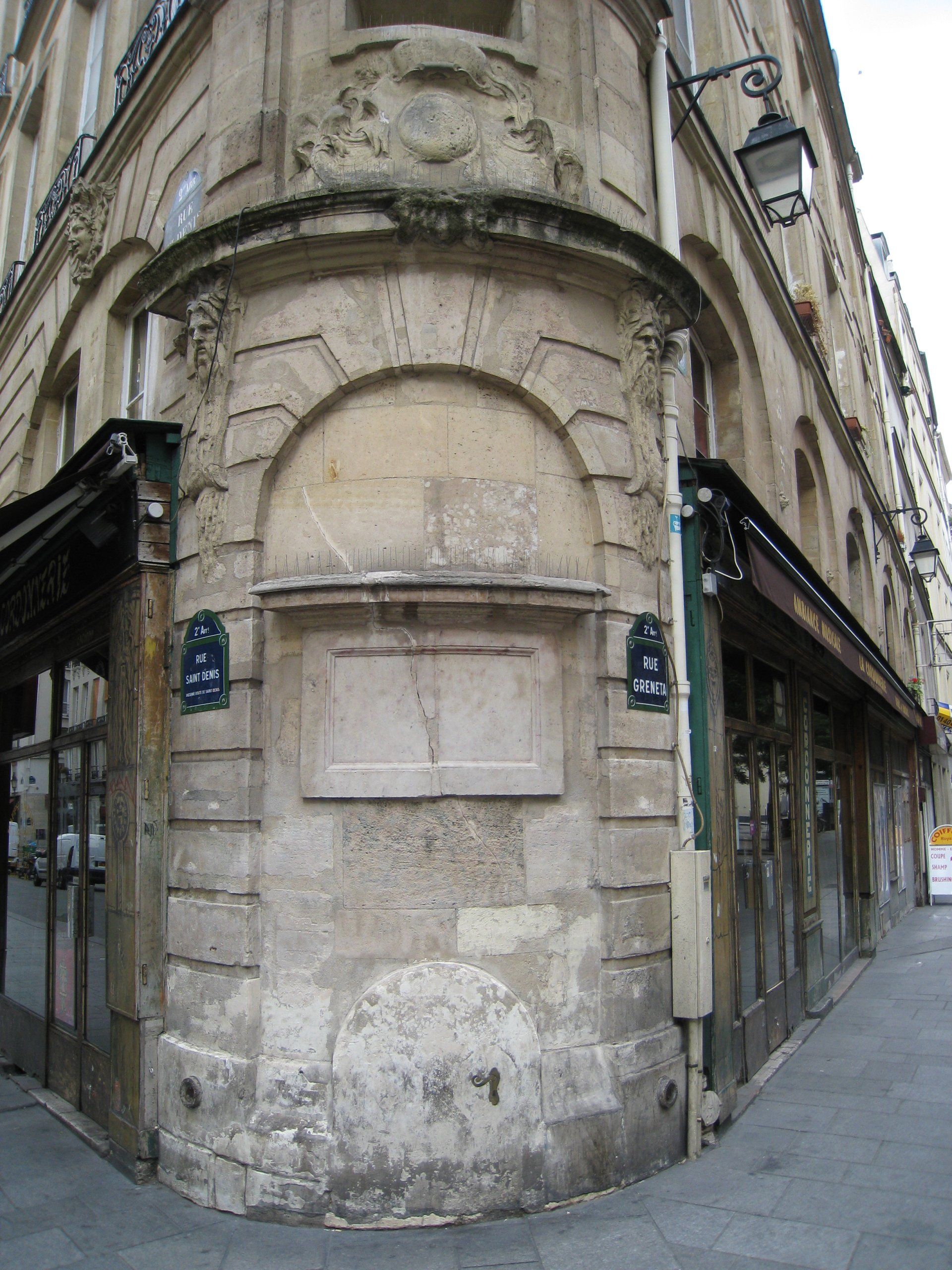 Formant un bel arrondi à l’angle des rues Saint-Denis et Greneta, cette vieille fontaine, désormais hors d’eau, fut construite en 1732 par Jean Beausire, alors âgé, qui s’associa à son fils, Jean-Baptiste-Augustin Beausire, architecte comme lui et avec lequel il signa là leur première œuvre commune.