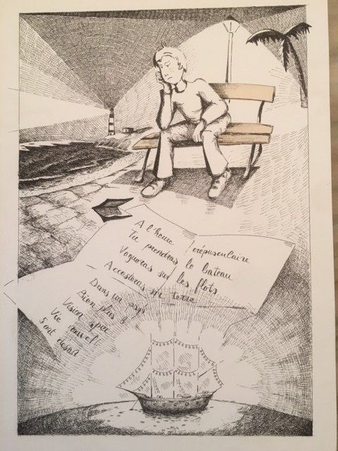 Quel curieux poème, songea t-il, on dirait un message. Il le lut plusieurs fois puis, levant la tête, il découvrit à l’ancre, au bout de la plage, un beau bateau blanc illuminé comme pour une fête. L’embarcation fantôme semblait l’attendre.