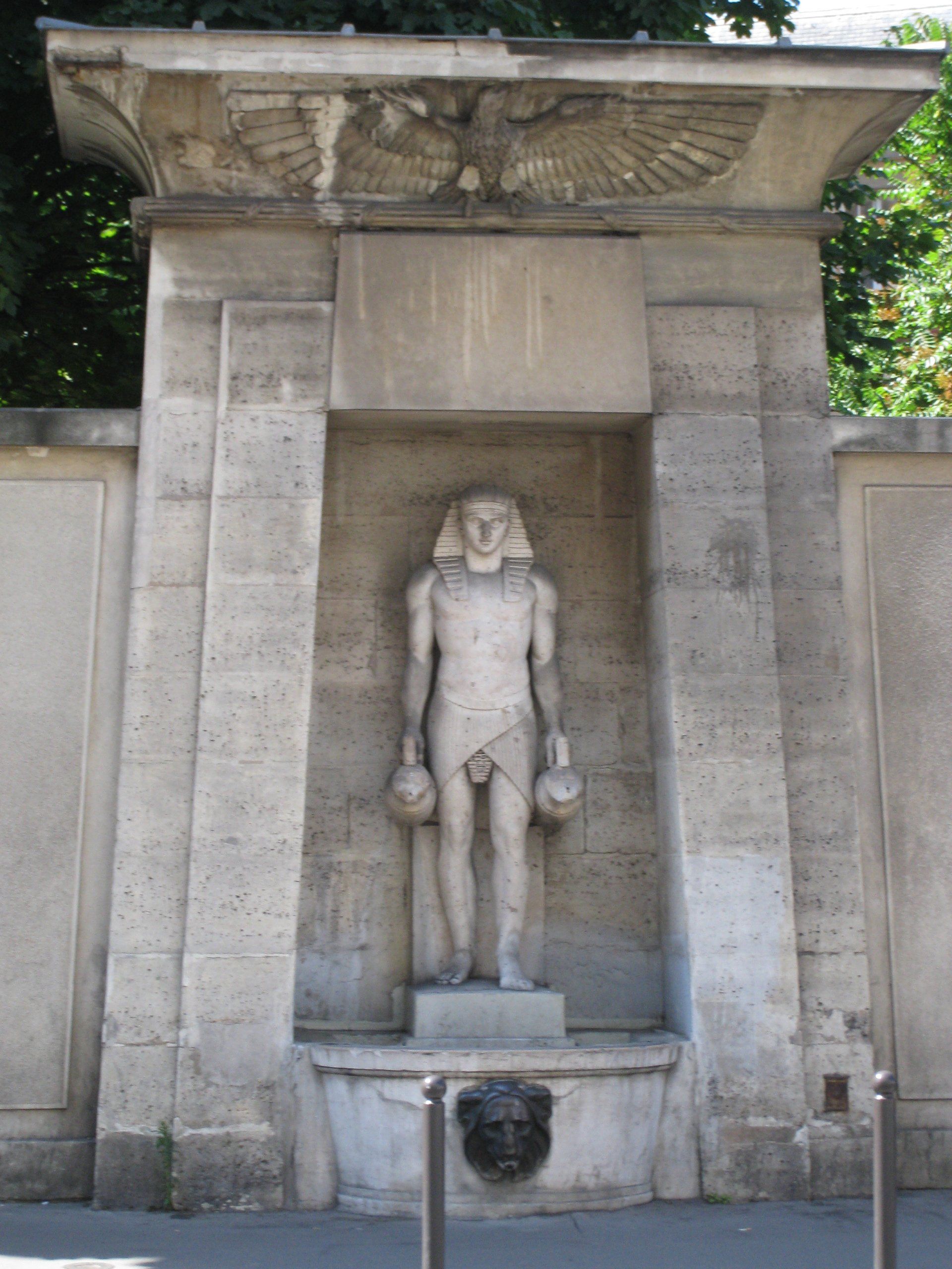 Conçue sous la forme d’une porte de temple égyptien, avec ses piédroits inclinés, la fontaine est surmontée d’un majestueux aigle aux ailes déployées.