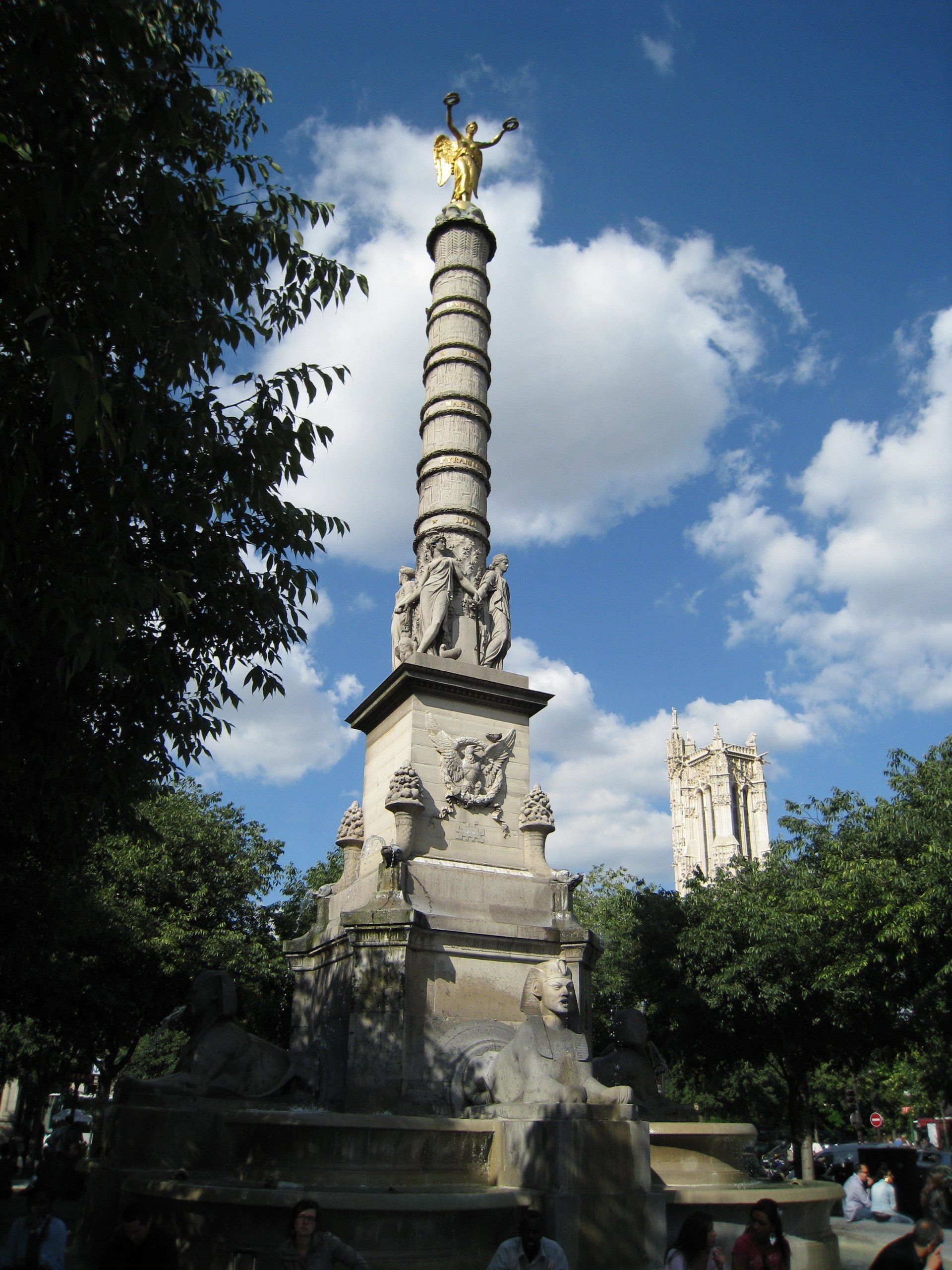 Lors des grands travaux d’Haussmann et du réaménagement de la place du Châtelet, en 1858, la fontaine fut déplacée d’une quinzaine de mètres et rehaussée, passant de 18 à 22 mètres de hauteur.
