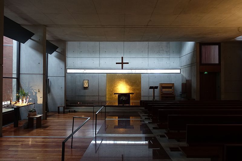 Créée en hommage à la chapelle Notre-Dame-du-Haut de Ronchamp, dessinée par Le Corbusier, l’architecte à fait appel ici au béton brut, au granit rouge de Suède et au bois.