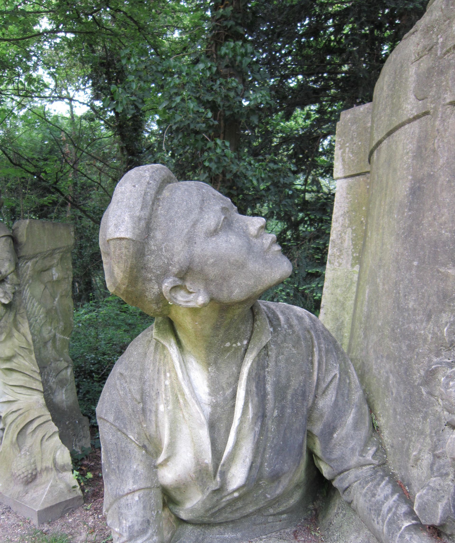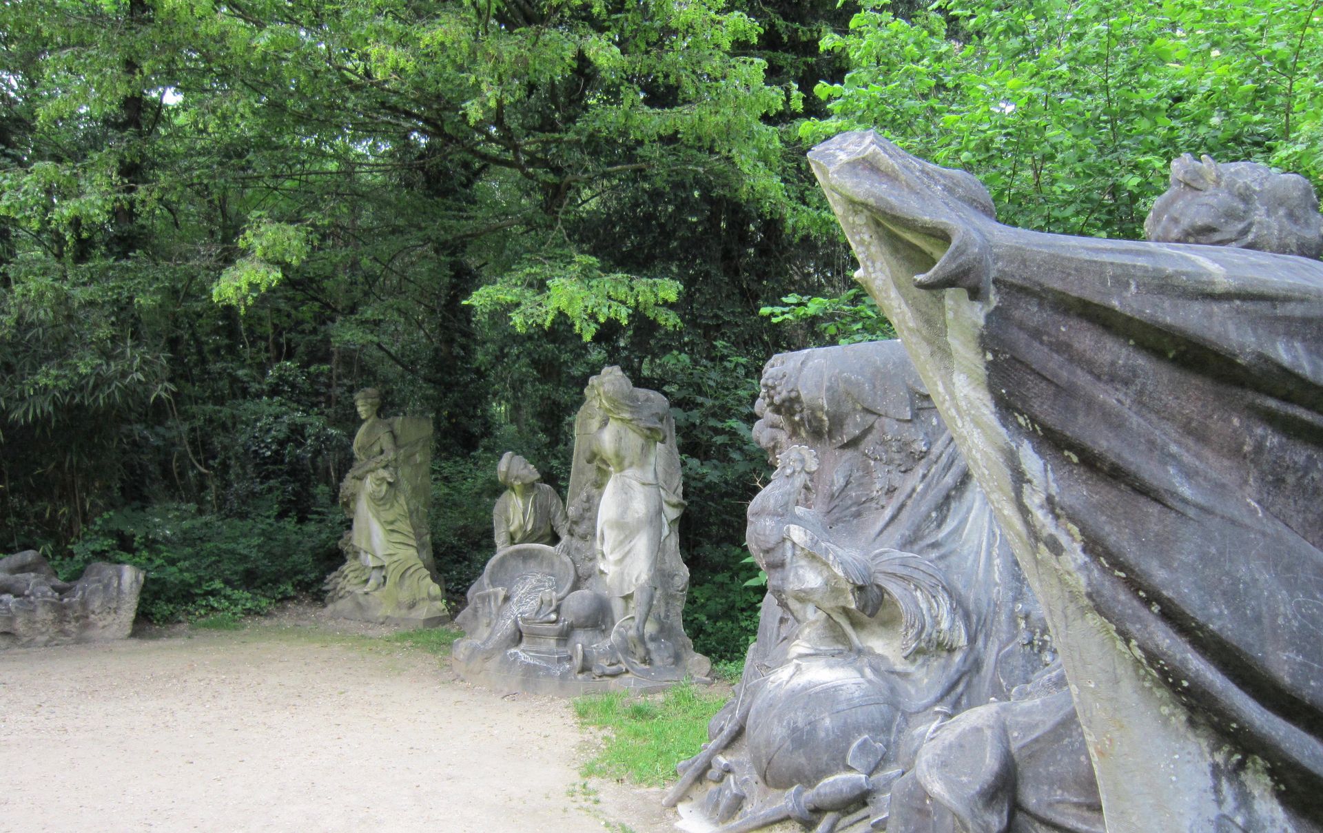 Cinq statues, provenant du monument à la gloire de l'expansion coloniale française de Jean-Baptiste Belloc, sont entreposées à même le sol, à droite de l'unique entrée du jardin, avenue de la Belle-Gabrielle.