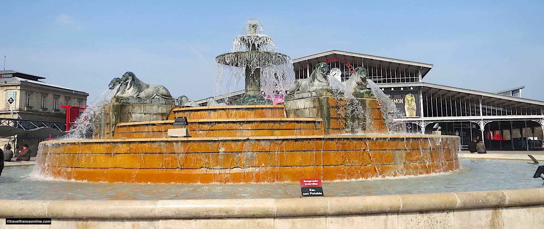 Sur le parvis sud, la fontaine aux Lions, élevée par Girard place du Château-d’Eau (place de la République), a été transférée ici à l’ouverture des abattoirs.