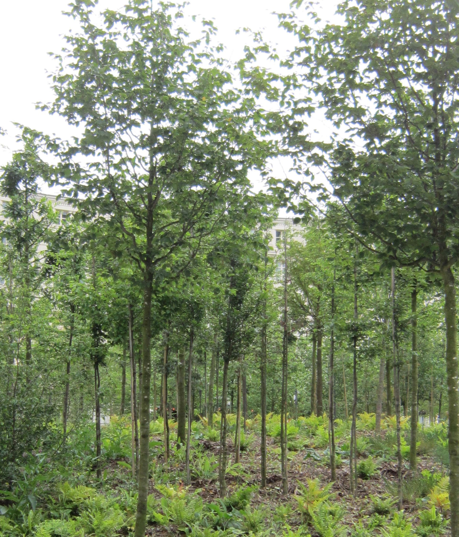 Une partie de la forêt urbaine se situe à environ 1,20 mètre au-dessus du niveau de la clairière, permettant de l’isoler visuellement de la circulation.