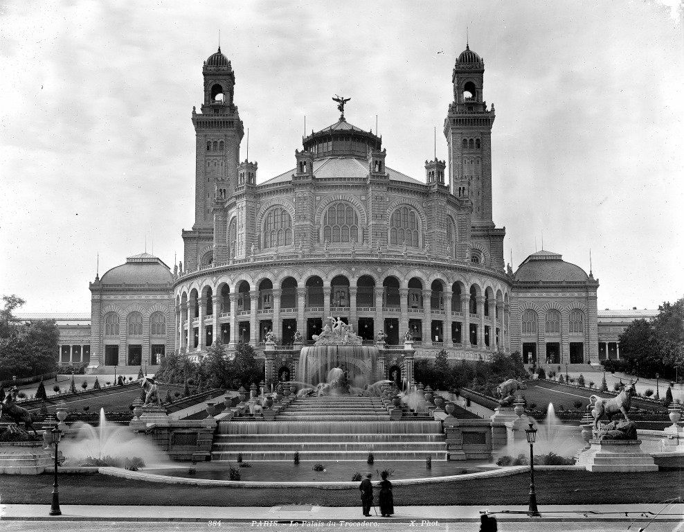 En 1876, on décida la construction d’un palais qui devait abriter salle d’opéra et galeries d’exposition pour l’Exposition universelle de 1878. Le projet de l’architecte Gabriel Davioud et de l’ingénieur Jules Bourdais fut retenu et ils édifièrent en moins de deux ans le palais du Trocadéro, qui se présentait comme une vaste rotonde de 58 mètres de haut encadrée par deux tours en forme de minaret de 70 mètres de haut et deux longues ailes courbes de part et d’autre. Devant le palais, tourné vers la Seine et le Champ- de-Mars, la pente fut aménagée en jardins avec jeux d’eau et cascatelles mettant en valeur le motif central, une chute d’eau haute de 10 mètres dévalant le terrain en cascade vers le fleuve. Après l’Exposition, l’ingénieur Alphand aménagea les jardins en les nivelant, tout en conservant la cascade et l’aquarium qui avait été construit pour l’Exposition par l’ingénieur Barrois dans la partie est de la colline.