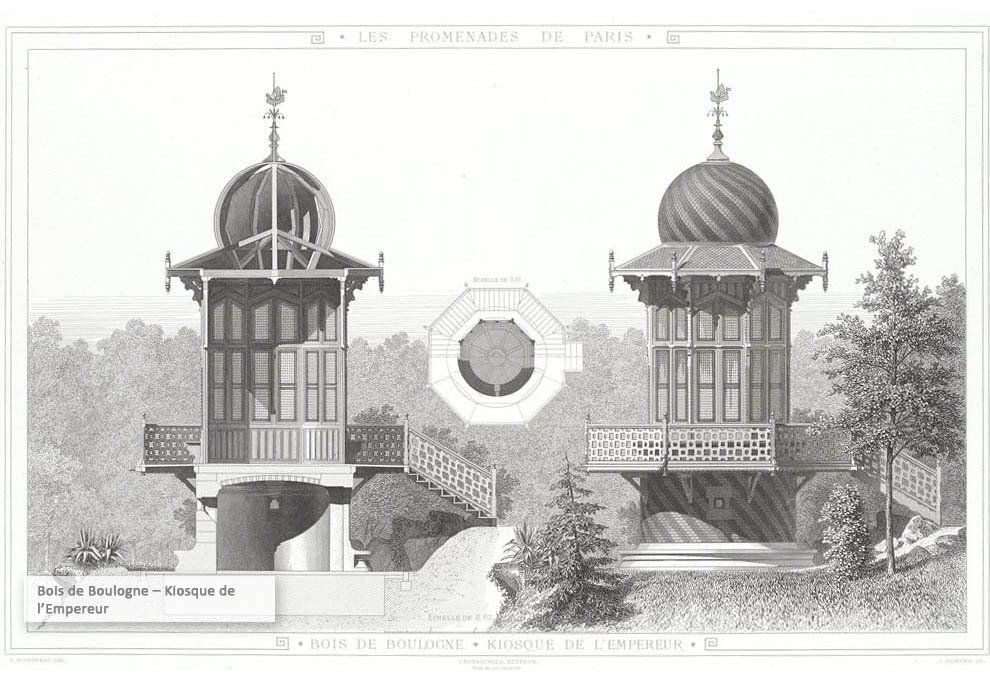 C’est la grande période des Expositions universelles ; celle de 1889 a vu s’élever la tour Eiffel et celle de 1900 le Grand et le Petit Palais. Les années 1900, c’est aussi la Belle Epoque et, tandis que l’architecte Hector Guimard dessine les entrées du métro parisien, inauguré en 1900, les jardins et les squares se peuplent de kiosques à musique. Si le mot kiosque est emprunté au turc et signifie pavillon de jardin, leur architecture est inspirée des pagodes chinoises et on a vu des kiosques orner les parcs depuis le XVIII° siècle. Les kiosques à musique ont été conçus à l’origine pour accueillir des formations musicales le plus souvent militaires et aujourd’hui, sur plus de quarante kiosques à musique présents dans les jardins de Paris, les deux tiers datent de la Belle Epoque. Ils ont un style caractéristique, avec leur ossature métallique, leur charpente de bois recouverte de zinc et souvent coiffée par un bulbe, leur soubassement de pierre ou de brique et leur forme octogonale ou hexagonale.