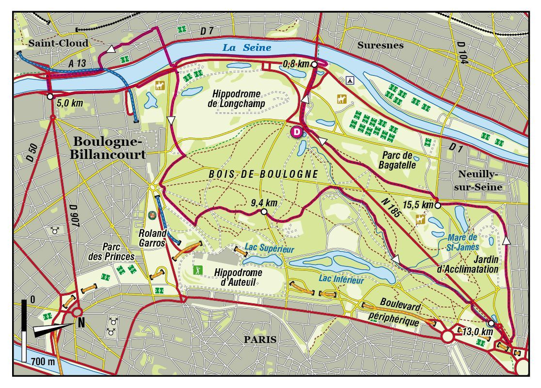 Aujourd’hui, si le bois de Boulogne n’a pas toujours bonne réputati on, surtout la nuit, il offre dans la journée un agréable dépaysement et de nombreux divertissements, avec ses 846 hectares qui conservent, pour l’essentiel, leur tracé de promenade à l’anglaise du Second Empire. Le bois possède de nombreuses espèces et l’on y trouve en quantités à peu près égales chênes, érables, hêtres, charmes, marronniers, tilleuls, pruniers, platanes et robiniers, tous plantés après 1815.