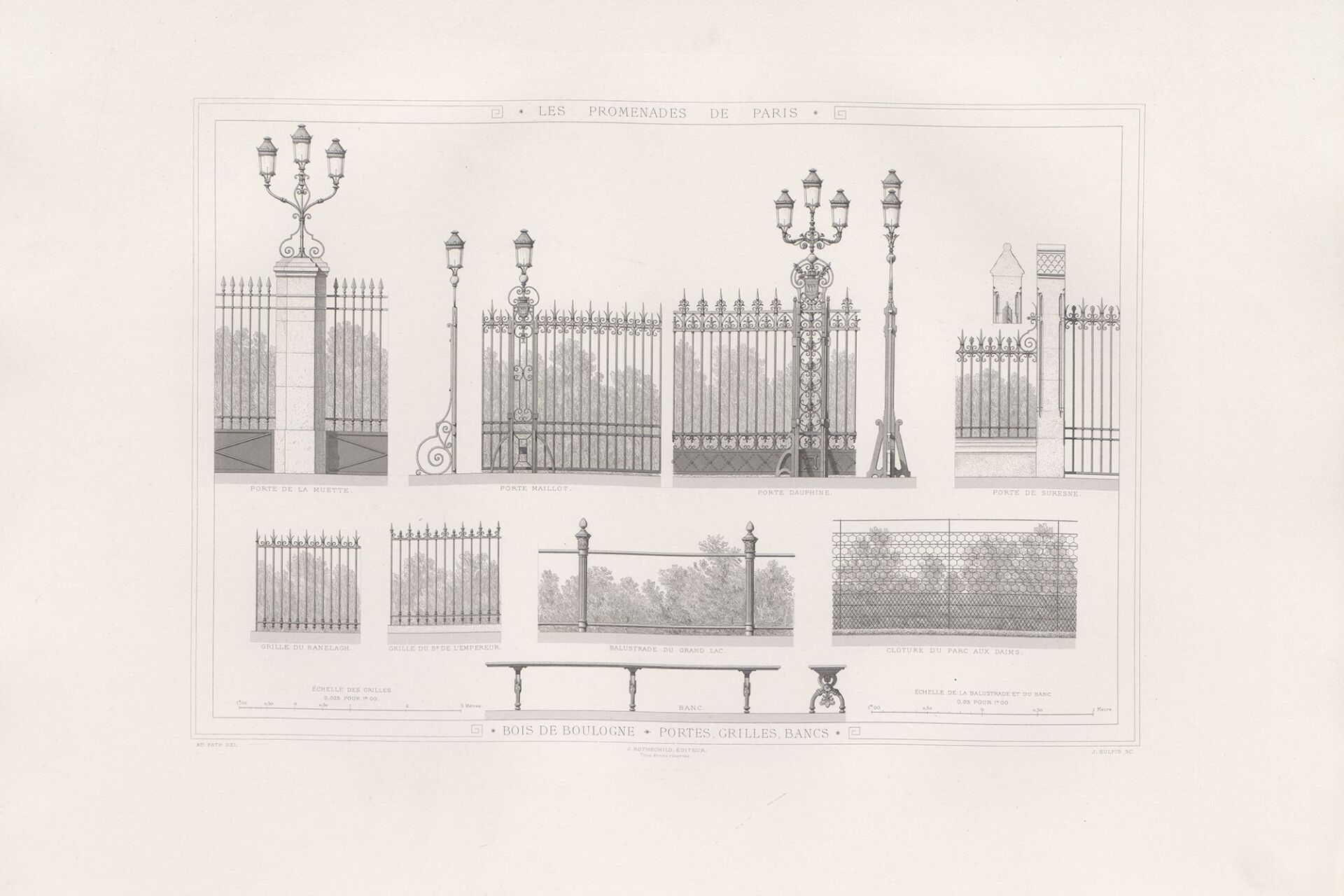 Les nouvelles avenues reçurent candélabres, kiosques à journaux, fontaines, vespasiennes et bancs ; les squares furent équipés de grilles de clôture et de bancs.