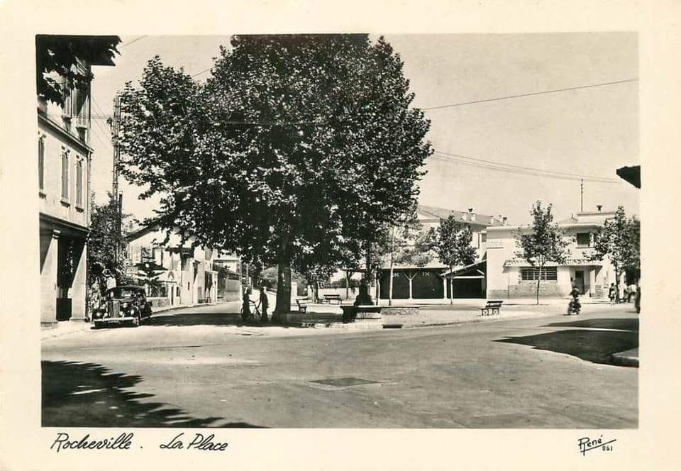 La place de Rocheville avec sa fontaine et son platane (mort au début du millénaire), le boulevard Paul-Doumer et l'ancienne église.