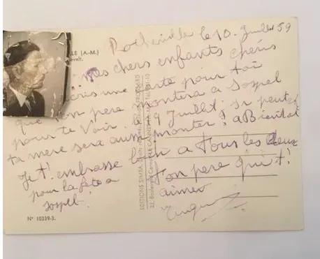 Au verso de la carte postale (photo 1), notre père nous annonce sa prochaine visite. Cet été-là, José et moi étions au Col Saint-Jean, à Sospel, la colonie de vacances de la ville du Cannet-Rocheville.