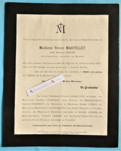 Faire-part de décès d'Adèle Colin, veuve Martellet.