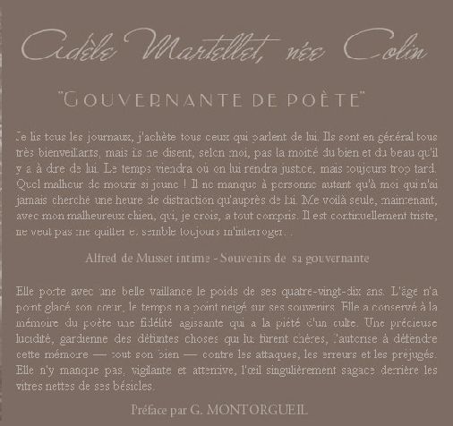 Tenant jusque dans son grand âge une boutique d'horlogerie rue Saint-Honoré et résidant au 7 de la rue de Duras voisine, elle publia, un demi siècle après la mort du poète, son témoignage des dix années immémoriales qu'elle passa à son service : Alfred de Musset intime, Souvenirs de sa Gouvernantepar Mme Martellet (Adèle Colin), 1906.