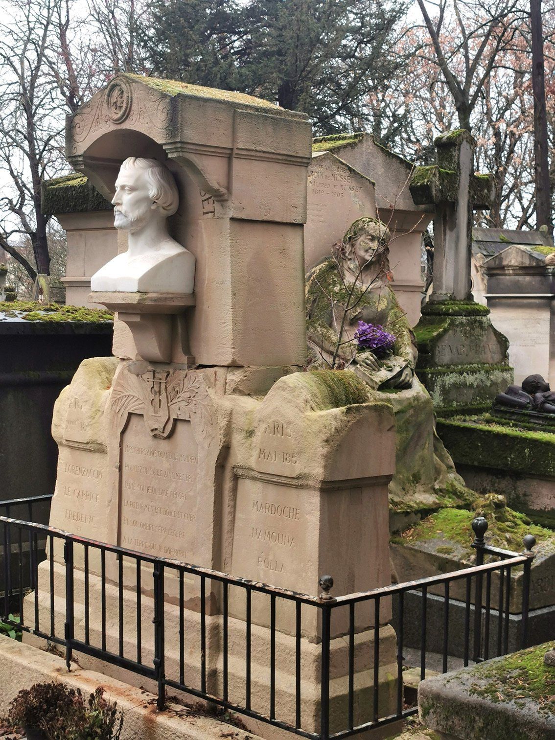 Avant de vous convier à une promenade qui vous permettra de faire un tour complet de la nécropole et de découvrir les plus belles de ses sépultures et les personnalités les plus célèbres qui y reposent, signalons que la partie la plus ancienne du cimetiére, la plus proche de l'entrée principale, a été classée en 1962 au titre des sites historiques et pittoresques. Là, 33 000 tombes sont inscrites à l'inventaire supplémentaire des monuments historiques. A l'intérieur de ce secteur, une zone importante d'environ dix hectares, la plus accidentée de la nécropole, est dite "romantique" en raison des nombreux représentants de ce courant qui y sont inhumés, tels Chopin ou Géricault. Enfin, ont été classés monuments historiques : le mur des Fédérés, la chapelle construite en 1823 par l'architecte Etienne -Hippolyte Godde (1781-1869) sur l'emplacement de l'ancienne maison des jésuites, la porte monumentale, boulevard de Ménilmontant, élevée par le même Godde en 1825, le monument aux morts de Bartholomé, ainsi que les tombes d'Héloîse et d'Abélard, de Molière, de La Fontaine et de l'abbé Delille.