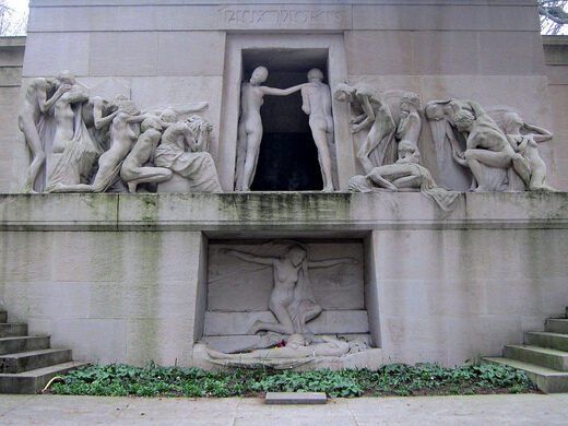 Ecrivain irlandais, auteur du Portrait de Dorian Gray, fut emprisonné à cause de son homosexualité. Au-delà de la mort il fait encore scandale, puisque des mains vertueuses ont amputé son monument funéraire. Le poète, en effet, y est représenté nu, sous la forme d'un sphinx ailé, en pierre, oeuvre du sculpteur expressionniste britannique Jacob Epstein (1880-1959). C'est une tombe culte du Père-Lachaise, visitée par des admirateurs venus du monde entier.