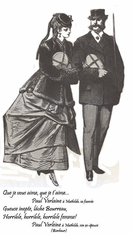 chanson : « Entre le moment de la demande de Verlaine, en juin 1869, et notre mariage, célébré le 11 août 1870, il s’est écoulé quatorze mois, pendant lesquels je me suis attachée jour par jour, et je puis dire en toute sincérité que, le jour où je l’épousai, je l’aimais autant qu’il m’aimait. C’est que moi seule ai connu un Verlaine tout différent de ce qu’il était avec les autres : Verlaine amoureux, c’est-à-dire transfiguré au moral et au physique. J’ai expliqué plus haut qu’en me regardant, sa physionomie devenait autre et qu’il cessait d’être laid. Au moral, le changement fut presque aussi complet. Pendant les quatorze mois de nos fiançailles, et pendant la première année de notre mariage, Verlaine fut doux, tendre, affectueux et gai ; oui, gai, d’une bonne gaité saine et communicative. Il cessa si bien de boire que ceux qui l’avaient connu avant son mariage le crurent à jamais corrigé, et que ni mes parents ni moi n’eûmes le soupçon qu’il avait été un ivrogne. Nous ne l’avons appris que trop tard hélas ! car, après ces deux bonnes années, Verlaine devint un être mauvais, lâche, hypocrite, d’une méchanceté noire et raffinée. Il employait son intelligence à faire le mal, et je puis dire aussi que personne n’a connu un Verlaine semblable à celui-là. Ceci dura d’octobre 1871 au mois de juillet 1872, époque de son départ. Un an de paradis, un an d’enfer et de souffrances continuelles, voilà ce que furent mes deux années de mariage. »