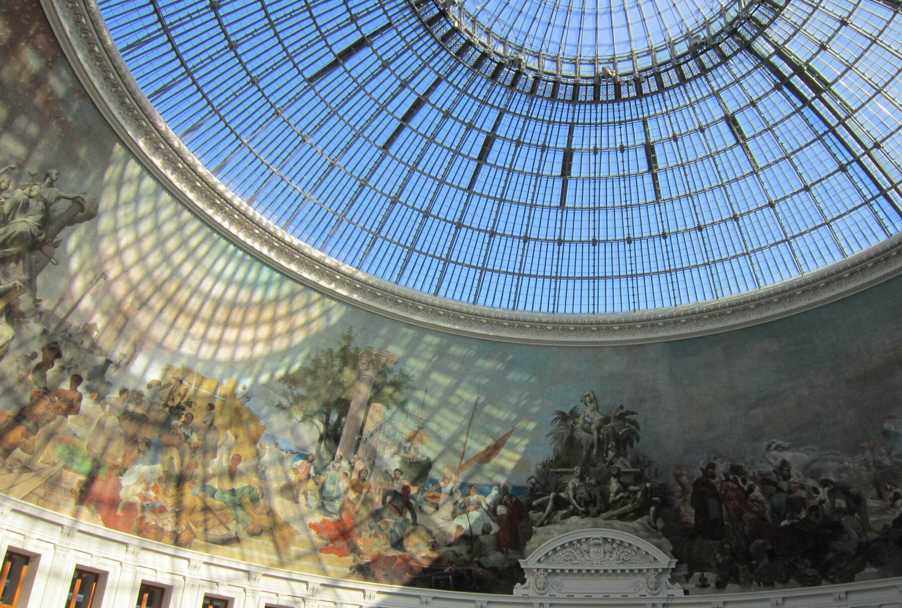 Un promenoir circulaire coiffant le cylindre, flottant entre la paroi de béton et la façade dessinée par Henri Blondel, invite à admirer la gigantesque toile marouflée du XIXe siècle qui ornemente la coupole.