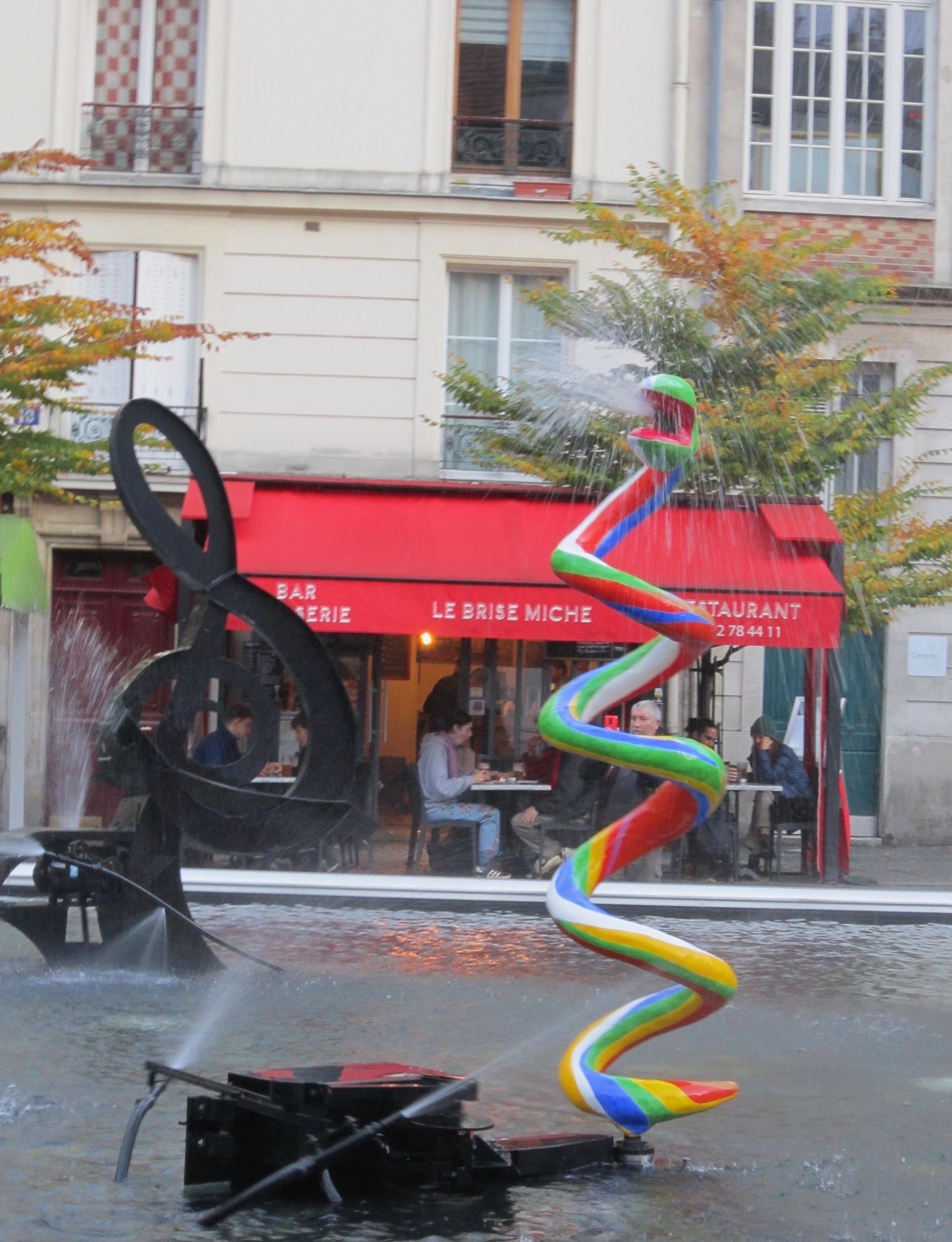Aménagée en 1983 sur le parvis de l’Ircam (Institut de Recherche et Coordination Acoustique/Musique), la fontaine offre une heureuse transition entre les arches gothiques du chevet de l’église Saint-Merri et les tubulures vivement colorées du Centre Pompidou.