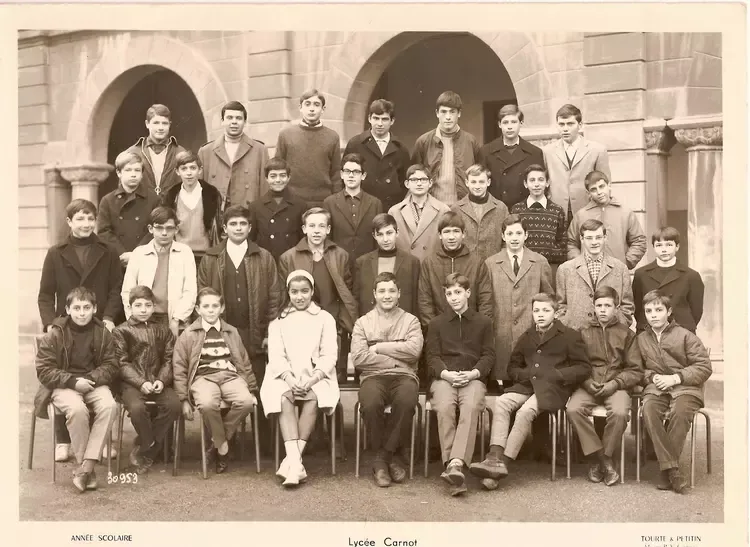 4e, année scolaire 1965-1966. Au second rang, le premier en partant de la gauche. 13 ans. Le lycée n'étant pas encore devenu mixte, il y avait cependant une fille, qui avait pu s'inscrire à Carnot pour y suivre en première langue des cours de russe, que seul notre établissement enseignait alors. Cette année-là, je grandis de 10 cm et grossis de 10 kg. Une croissance soudaine, qui eut des conséquences funestes sur mes notes. Mes professeurs décidèrent de me faire redoubler la classe, à mon grand désespoir !