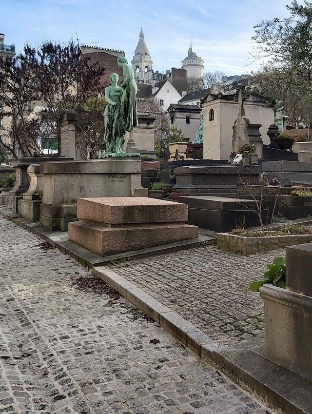 "Reste, reste à côté de moi Reste, reste moi aussi j'ai froidª Ballade pour une Pauline triste - MICHEL BERGER LE CIMETIERE DE MONTMARTRE Entrée principale : 20, avenue Rachel. 18e arrondissement Métro : Place-de-Clichy Tél. : 01 53 42 36 30 Le cimetière du Nord, communément appelé cimetière de Montmartre, a ouvert ses portes le 1er janvier 1825. D'une superficie de près de 11 hectares, il s'étend à l'ombre de quelque 750 arbres, essentiellement des érables, auxquels s'ajoutent quelques marronniers, tilleuls et thuyas. Si, aujourd'hui, cette paisible nécropole vallonnée, où Berlioz aimait tant venir se promener, jouit de la faveur des Parisiens, il n'en a pas toujours été ainsi. Carrières de plâtre et fosses communes Le site sur lequel s'inscrit le cimetière est plutôt de sinistre réputation. Au XVIIIe siècle, les terrains occupés par le cimetière actuel donnent accès aux carrières de plâtre nombreuses dans ce secteur. A la Révolution, ces exploitations, abandonnées, servent de fosse commune aux victimes des émeutes, dont plusieurs centaines de Gardes suisses tués aux Tuileries le 10 août 1792. Bientôt, et durant quelques années, cette nécropole, dite "des Grandes-Carrières" ou encore "de la Barrière-Blanche", reçoit les corps d'une bonne partie des Parisiens qui ne peuvent plus être enterrés dans la capitale, à la suite de la fermeture de tous les cimetières intra-muros. Ils y sont inhumés dans des conditions déplorables. Du cimetière sous Montmartre au cimetière de Montmartre Pour mettre un terme à cette situation, la Ville de Paris achète, en septembre 1798, au sieur Aymé, un terrain d'un peu plus d'un hectare afin d'offrir à une partie de la population de la rive droite un cimetière décent et non plus un dépotoir. Baptisé "Champ du Repos" ou "cimetière sous Montmartre", il se révèle malheureusement bien vite insuffisant. Les tentatives d'agrandissement ayant échoué, il doit fermer quelques années plus tard. Il faut cependant trouver une solution. A la suite de la restructuration du quartier entre 1818 et 1824, un nouveau cimetière, dix fois plus grand, est aménagé et devient, l'année suivante, l'actuel cimetière de Montmartre. Ajoutons encore, pour clore le chapitre historique, que pendant près de trente ans, dans la deuxième partie du XIXe siècle, il a été presque deux fois plus grand qu'il ne l'est maintenant. En 1847, en effet, avaient été annexés des terrains voisins, d'une superficie de 9 hectares, composant le quadrilatère formé désormais par les rues Etex, Coysevox, Marcadet et Eugène-Carrière. Cette partie, réservée aux concessions temporaires et gratuites, a été désaffectée en 1879, date à laquelle ces concessions ont été transférées dans les cimetières parisiens extra-muros. On y accédait par un tunnel, aujourd'hui muré, au bout de l'avenue du même nom. Sur une portion des terrains ainsi dégagés ont pu être créés entre autres, l'hôpital Bretonneau et le square Carpeaux. Depuis cette époque, le cimetière est resté pratiquement inchangé, hormis la prolongation de la rue Caulaincourt jusqu'au boulevard de Clichy par un pont métallique construit en 1888, puis élargi en 1987-1988. Aujourd'hui le cimetière de Montmartre compte plus de 20 000 concessions et 500 personnes y sont inhumées chaque année. Les gloires du cimetière de Montmartre Malgré une superficie quatre fois moins importante, le cimetière de Montmartre offre bien des similitudes avec le Père-Lachaise : même relief accidenté voire labyrinthique, même proportion de chapelles de tous styles et de toutes dimensions, même profusion de sculptures, en majeure partie de la deuxième moitié du XIXe siècle et du début du XXe. Ainsi qu'une semblable densité de personnalités. Toutefois, en raison probablement de sa position géographique au nord de la rive droite, on notera ici une importante proportion de compositeurs, chanteurs et danseurs d'opéra ou d'opérettes et de sociétaires de la Comédie-Française !